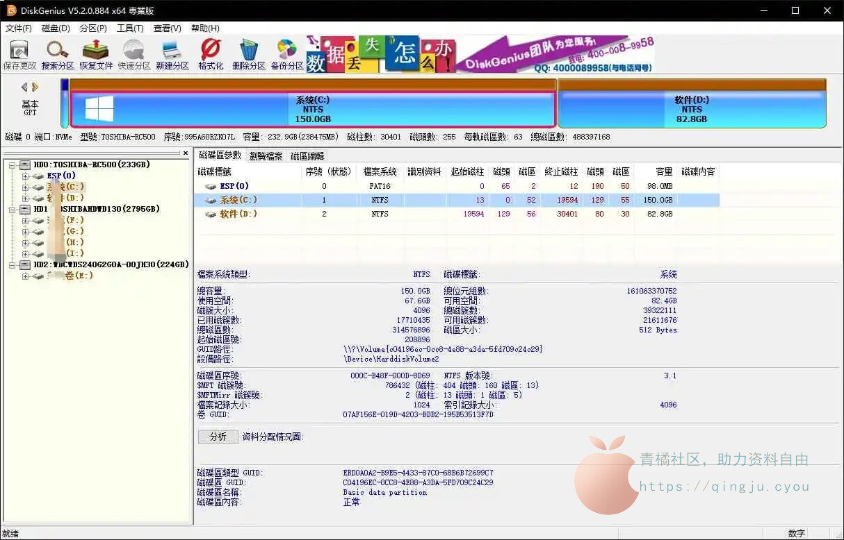 DiskGenius有免费版、标准版与专业版三个版本状态(功能对比)。三个版本共用同一个发行包,不必分别下载。