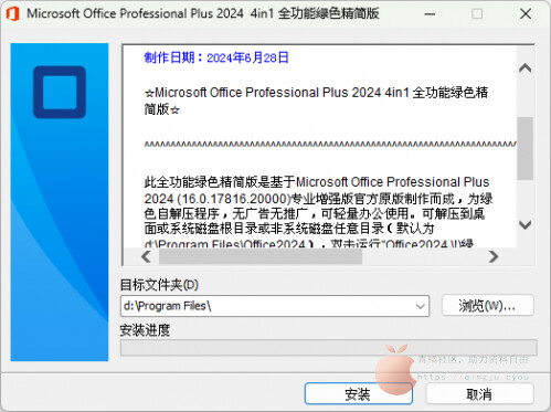此全功能绿色精简版是基于Microsoft Office Professional Plus 2024 (16.0.17816.20000)专业增强版官方原版制作而成,为绿色自解压程序,无广告无推广,可轻量办公使用。可解压到桌面或系统磁盘根目录或非系统磁盘任意目录(默认为d:\Program Files\Office2024),双击运行"Office2024 !)绿化.cmd”,点击桌面图标“Word 2024”“Excel 2024”“PowerPoint 2024”“Access 2024”运行程序即可。