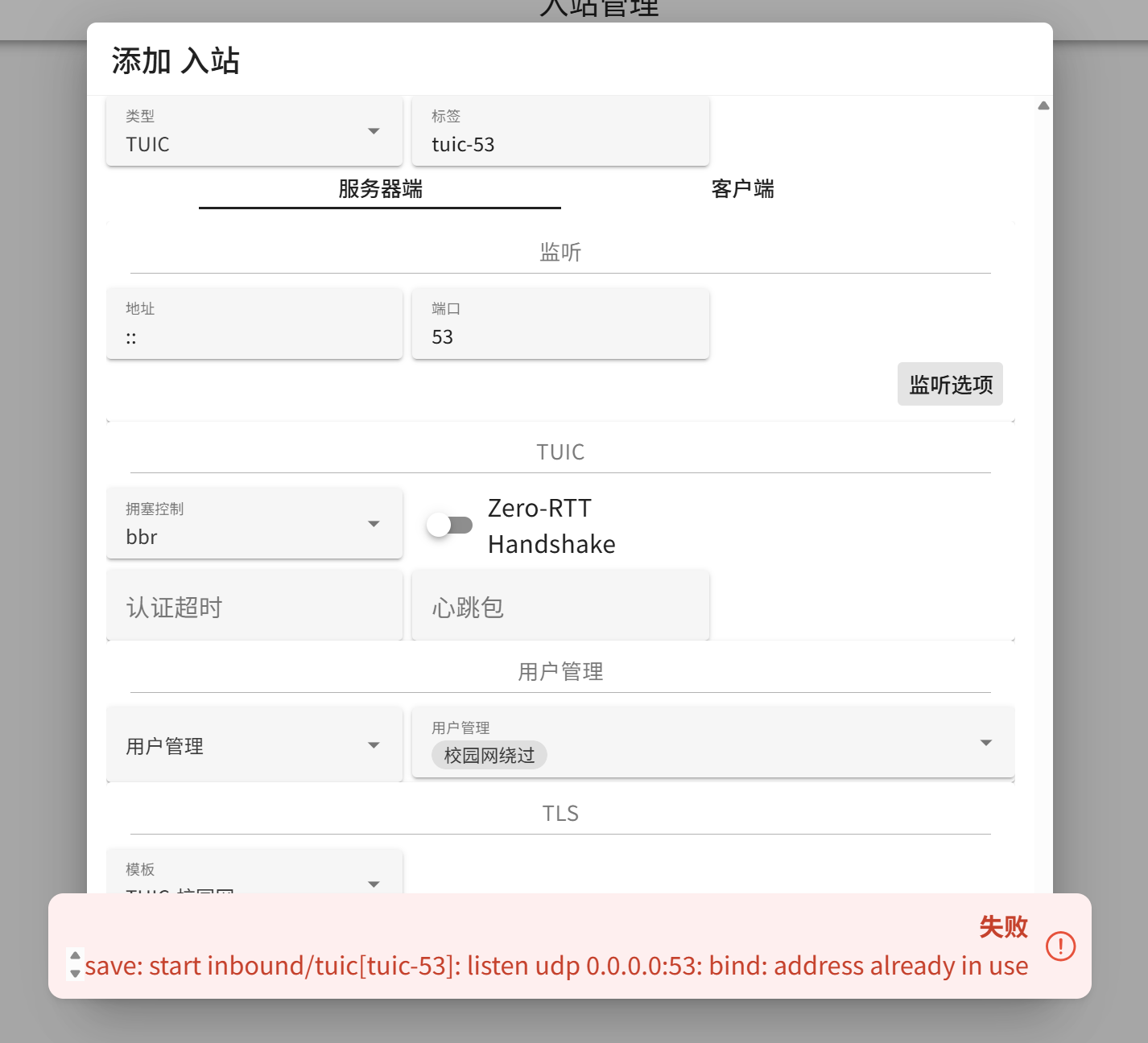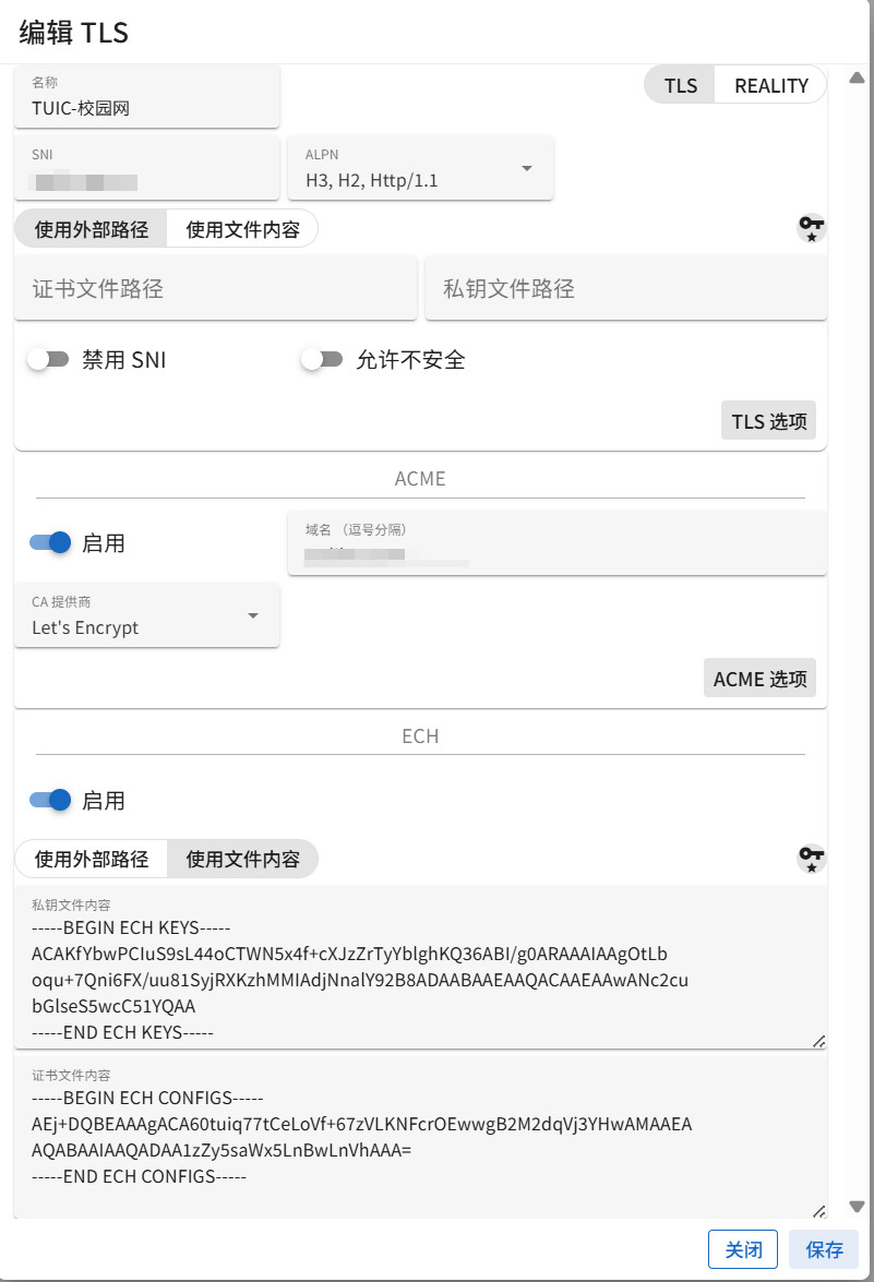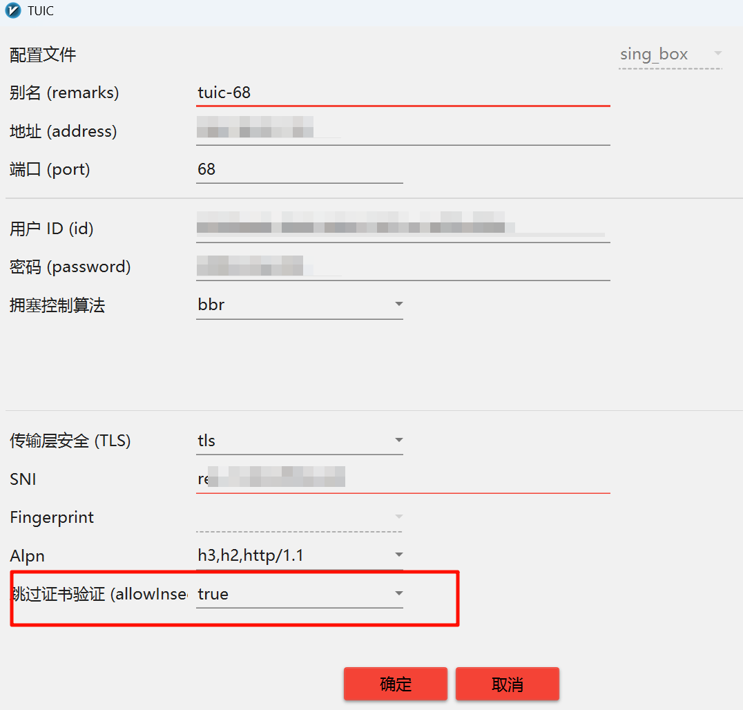 另一个就是TUIC在直接使用订阅更新下,不通的情况。可以将其中的跳过证书验证开启