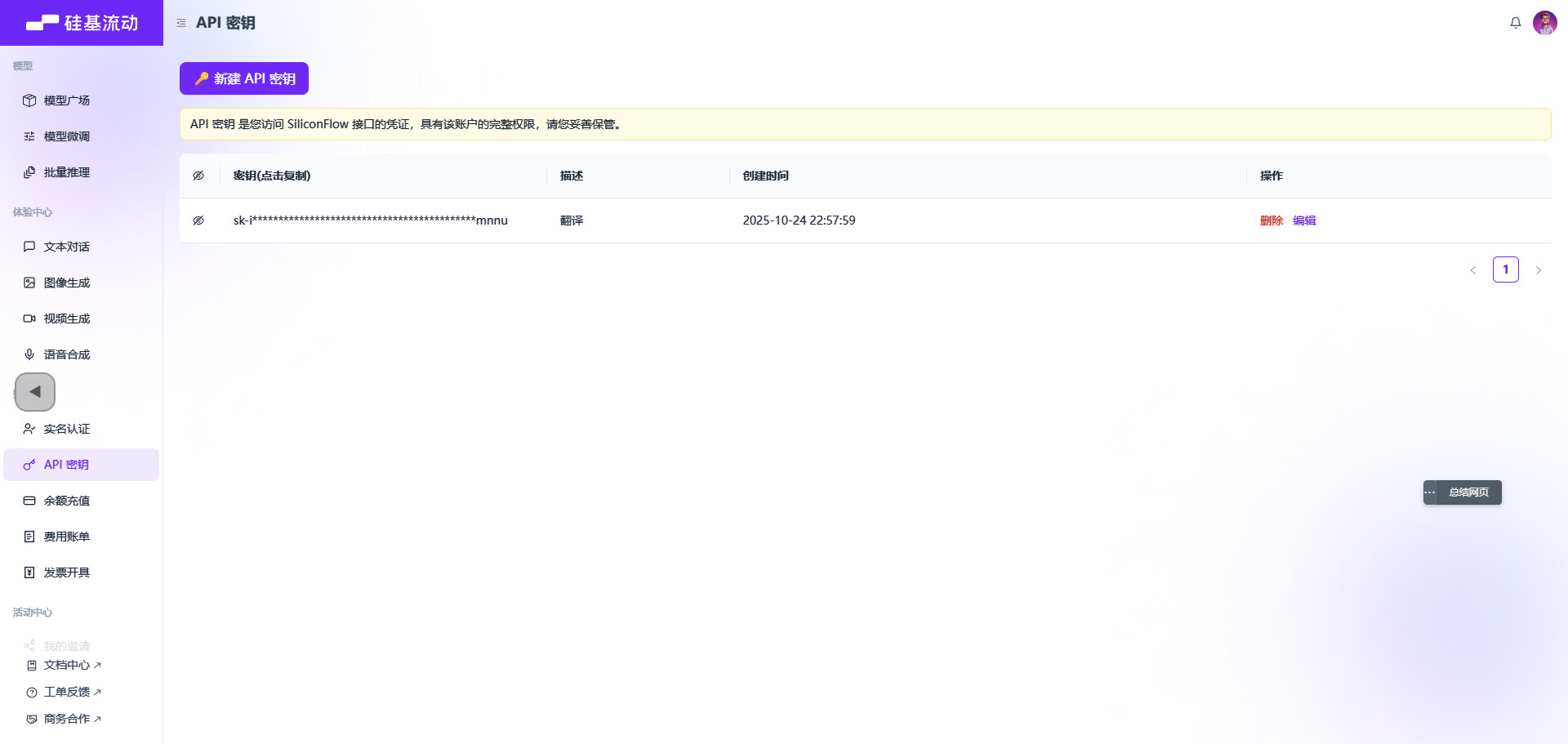 注册链接:硅基流动统一登录 - 2.新建API 密钥;