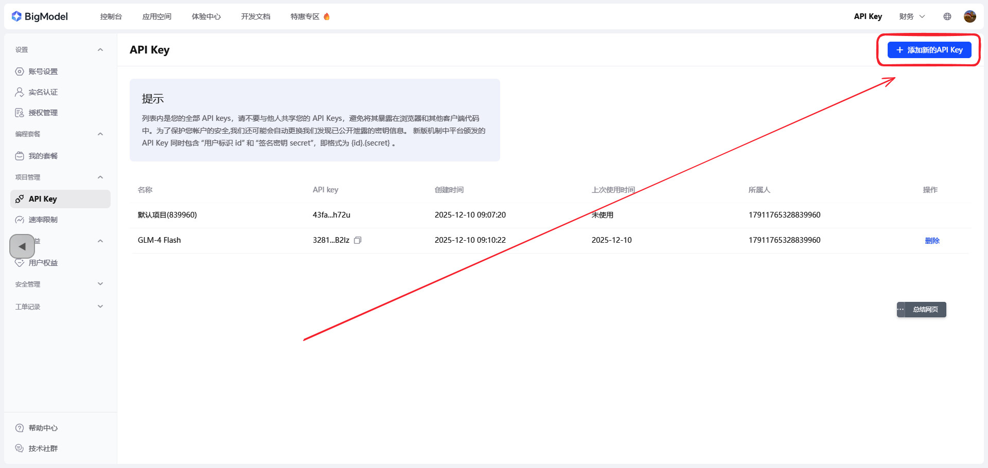 注册链接:智谱AI开放平台 - 2.新建API 密钥