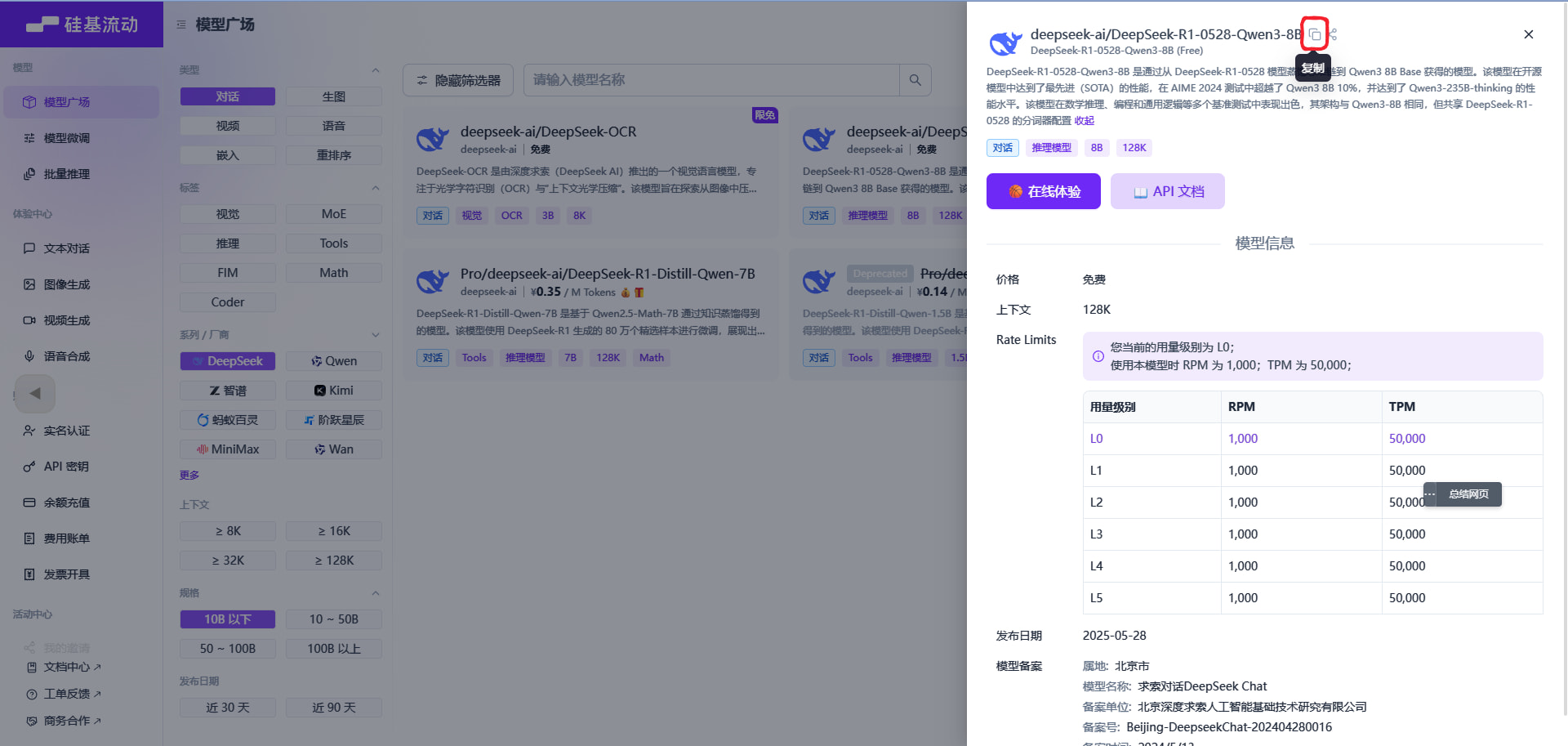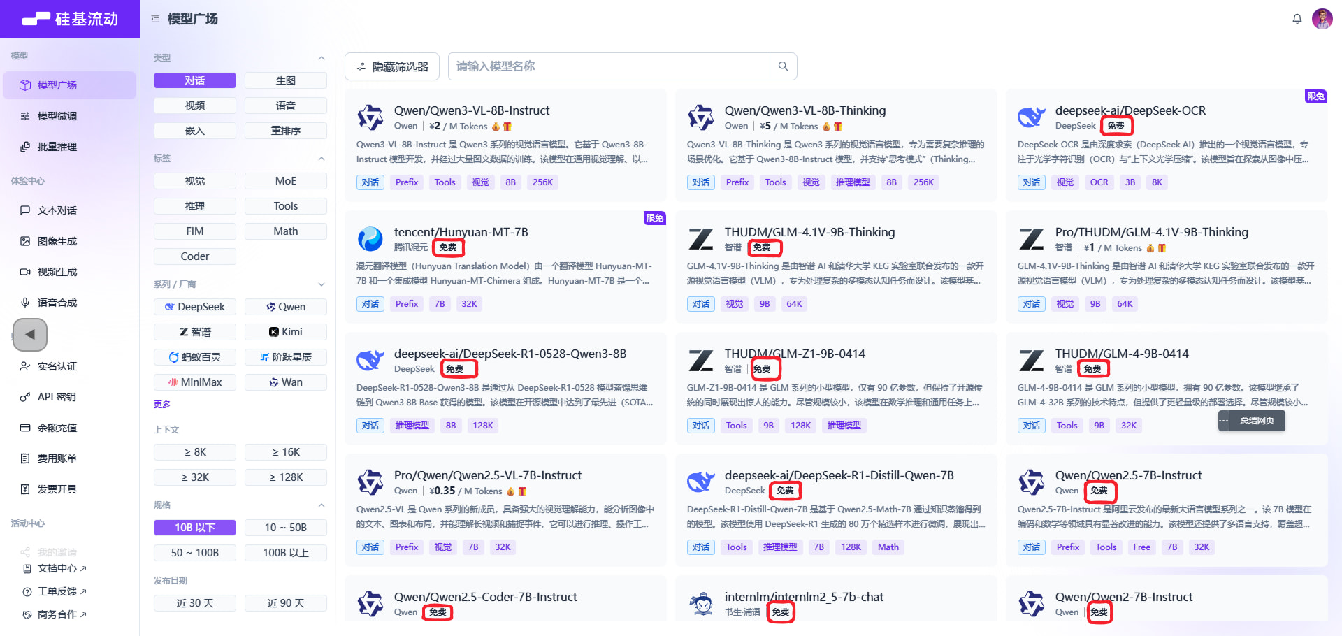 - 3.在【模型广场】选择合适的免费对话模型,只有规格10B以下的模型才有免费的,现在不支持筛选免费模型,可以手动搜索快速定位;