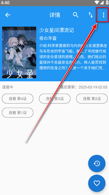 1、打开芝士漫画app,点击自己喜欢的漫画,在详情界面点击右上角的三个点