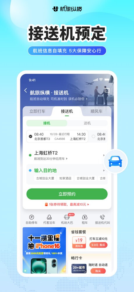 用车:接送机延误免费等、误机必赔偿,租车场站取还便捷、免千元押金