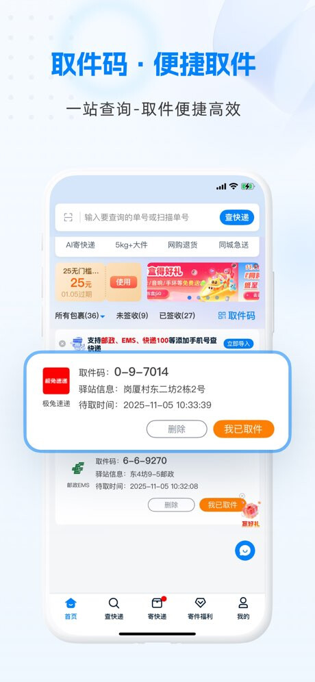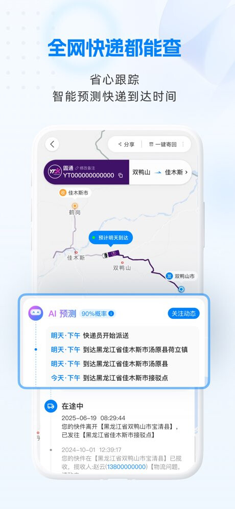 全球3000+快递公司一站式查询,支持输入、扫描、图片识别、手机号绑定等查件方式,自动保存查件记录,支持多设备同步物流信息。物流地图实时展示包裹轨迹,AI智能预测送达时间,异常情况即时提醒并自动更新。全程智能跟踪包裹,助您随时掌握快递动态。