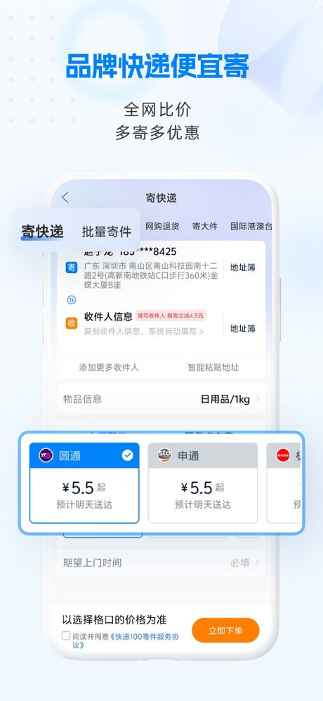 含多品牌快递比价优惠寄、批量寄、国际寄、大件寄、同城急送及网购退货,上门取件,丢损必赔,便捷省钱,满足您不同物流需求!