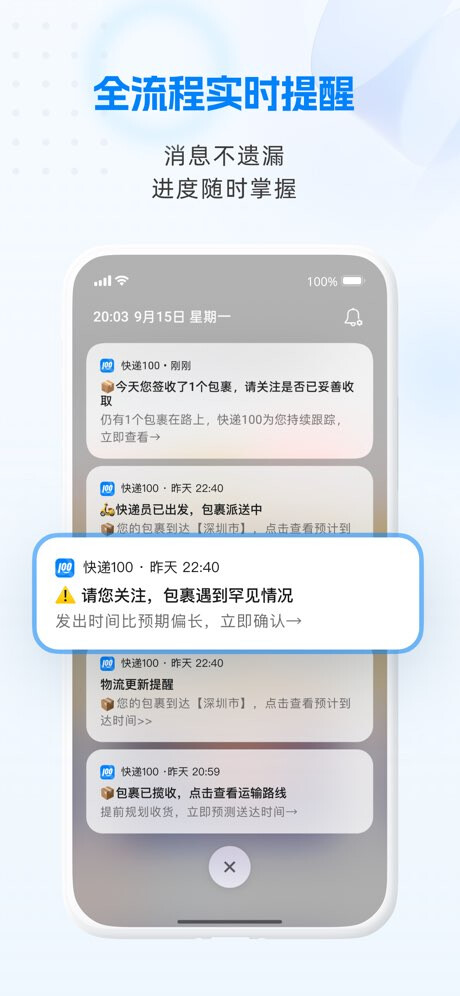 快递100是全球快递物流一站式数智服务平台、中国快递物流信息云服务领导品牌、福布斯中国人工智能新锐企业,为个人消费者、行业从业者、企业及各类组织提供全球快递物流查询、寄件、揽件、管理等聚合平台服务和数智化解决方案,满足其无法被单个快递物流公司满足的整合型需求。