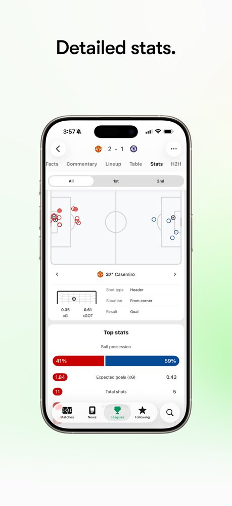 • 详细的比赛数据,包括预期进球(xG)和射门图