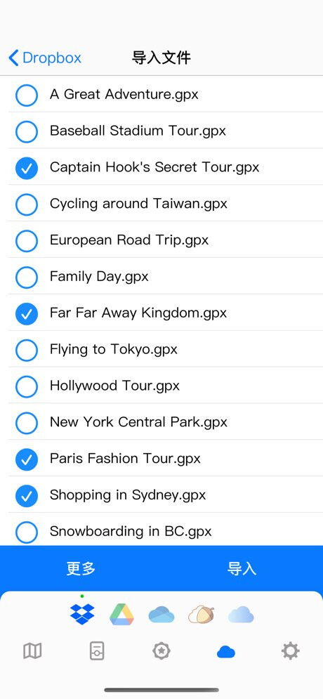 • 支持导入 GPX 和 KML 文件(可以使用其它的 GPS 装置记录轨迹再导入 APP)