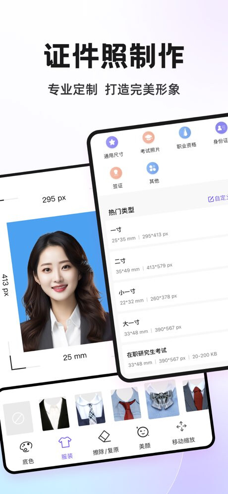 证件照相机+多种证件照尺寸+自动抠图+修改底色+精美的男女正装+美颜