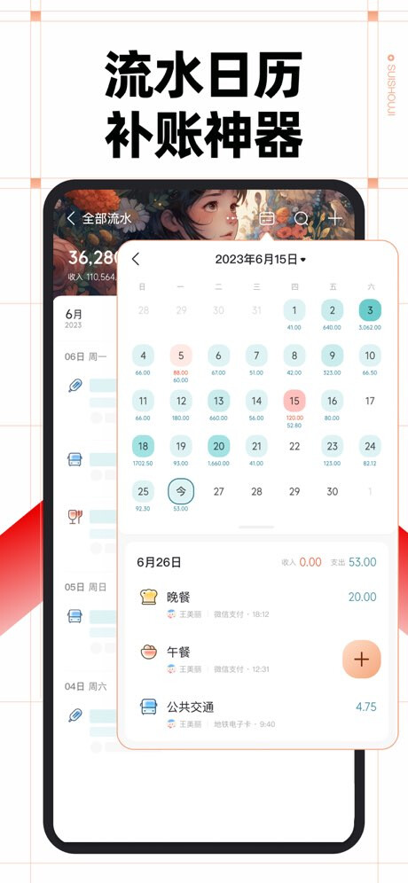 - 多维度查看收支流水,搭配流水日历轻松补账