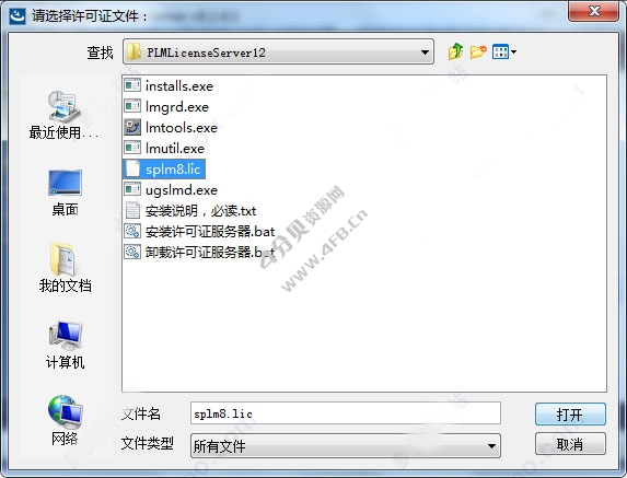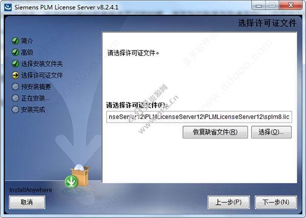 4、安装目录保持默认,许可文件这里,我们选择刚修改的“splm8.lic”载入,然后完成安装