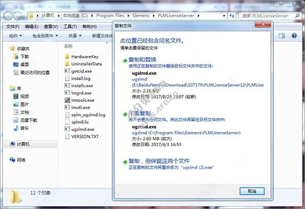 5、将破解许可目录下的“ugslmd.exe”,复制到许可安装目录下覆盖源文件,默认安装目录为C:\Program Files\Siemens\PLMLicenseServer