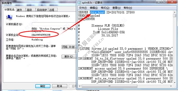 2、然后在【激活文件】文件夹内,找到UG12.0许可文件“splm8.lic”,右键以记事本方式打开,将“this_host”修改为计算机名后保存退出,计算机名可以右键点击计算机《属性《高级系统设置中查看
