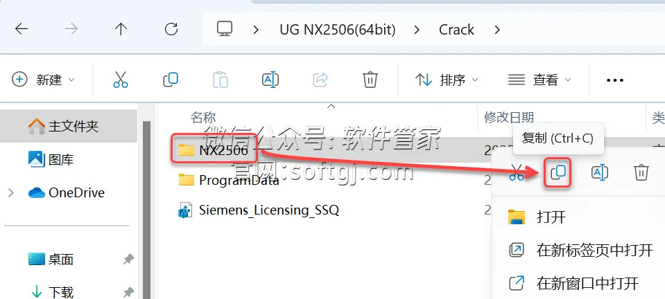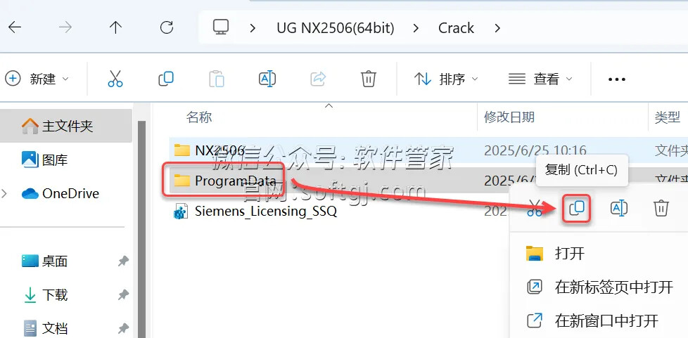 10.打开安装包解压后的【UG NX2506(64bit)】文件夹中的【Crack】文件夹,鼠标右击【ProgramData】文件夹选择【复制】。