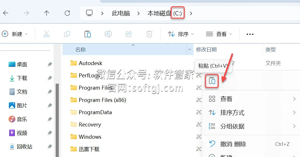 11.打开电脑C盘,鼠标右击空白处选择【粘贴】。